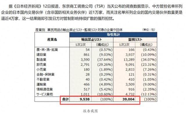 时隔半月之后,东京商工访问公司(TSR)公布访问数据炫夸,此前中国商务部将40家日企分辩列入出口料理管控名单和关爱名单,其中管控名单内的20家日企,背后关联着9538家买卖伙伴,列入关爱名单的另外20家实体,在日本国内来回伙伴,更是达到惊东说念主的4万家。这一轨则赶快激勉日方对料理影响不绝扩散的狠恶担忧。